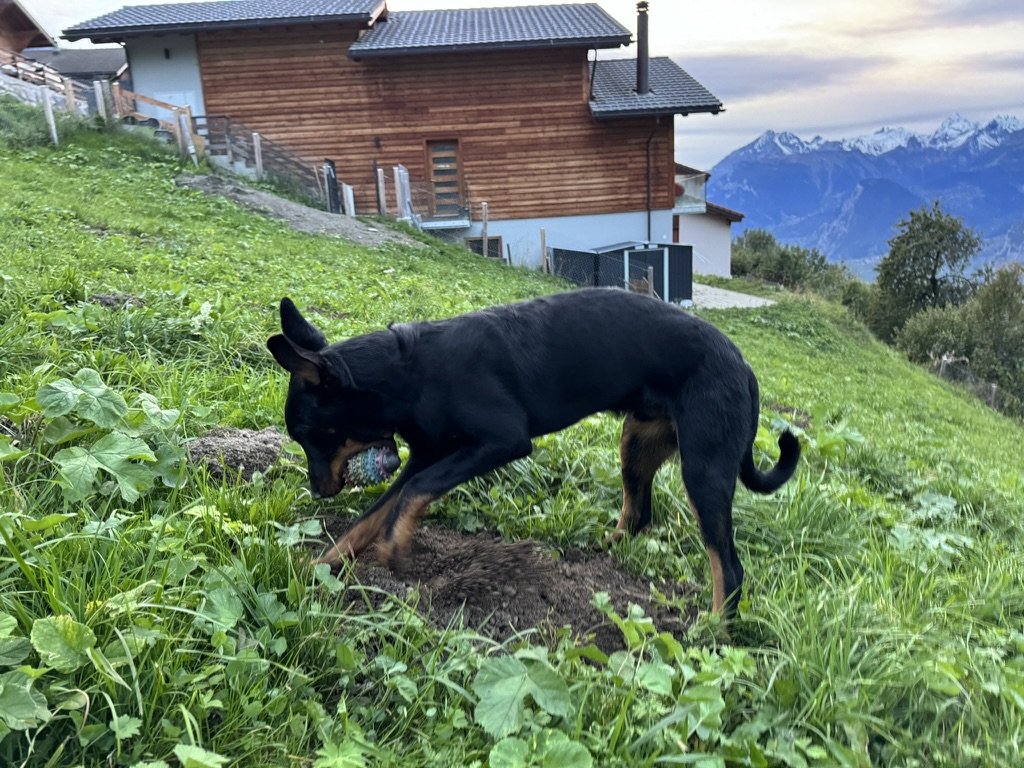 Vivre à Veysonnaz, c’est offrir à nos chiens un cadre de vie unique, où l’air pur des montagnes et les paysages grandioses deviennent leur quotidien. Ici, la nature est reine : les sentiers bordés d’arbres, les eaux claires des bisses et les vastes espaces verts sont autant d’invitations à la découverte. Cet environnement favorise leur équilibre physique et mental, tout en les rapprochant de leurs instincts naturels.